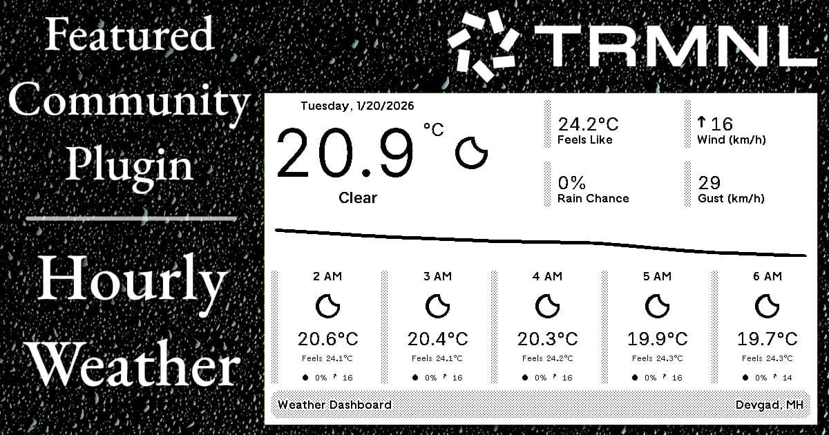 In monsoon season, what's happening in the weather this week is less important than what is happening within the next 6 hours. That's why Ronak, a TRMNL engineer, selected the Hourly Weather plugin by Shriram Datar as a featured plugin, because when it's important, you want to make sure you can see it before it's too late. Here's what Shiram had to say, in their own words.